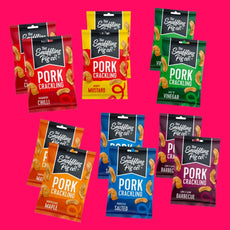 Porky Puffs are a lighter, fluffier, crunchier pork rind available in 4 MEGA flavours.